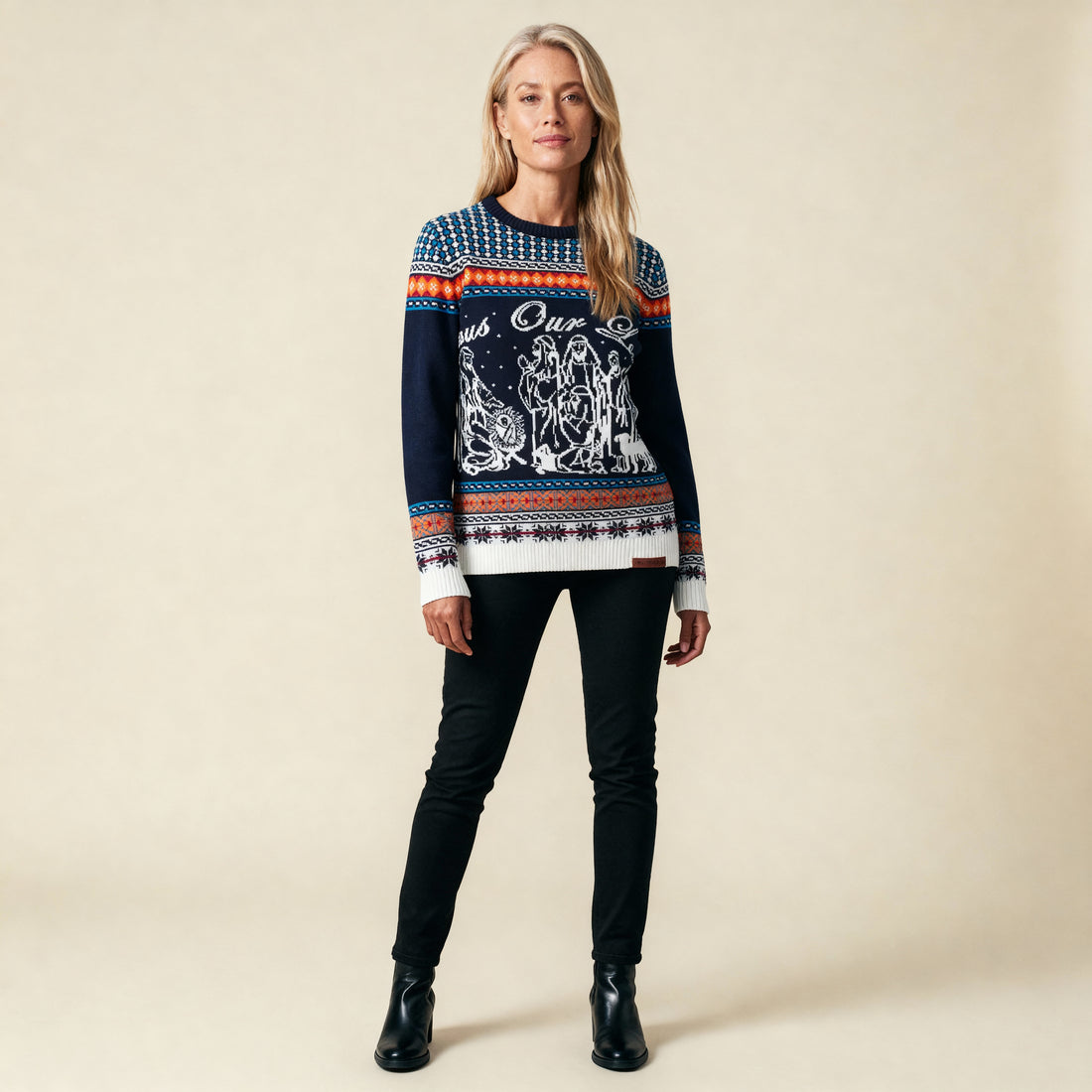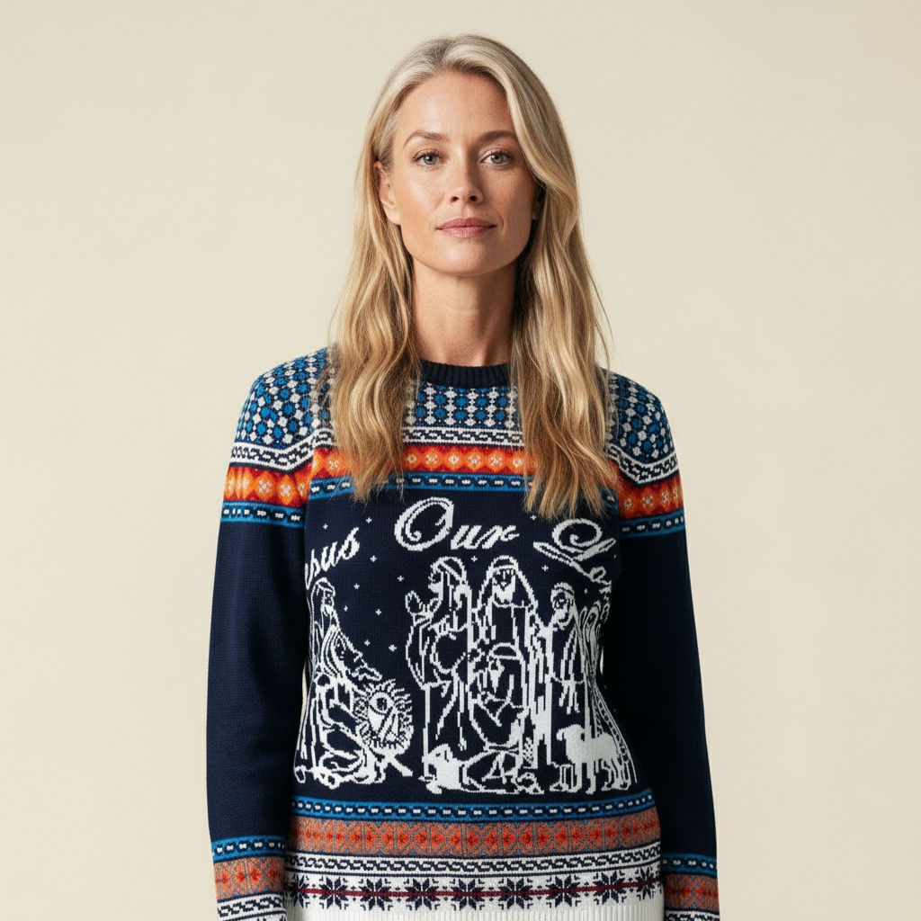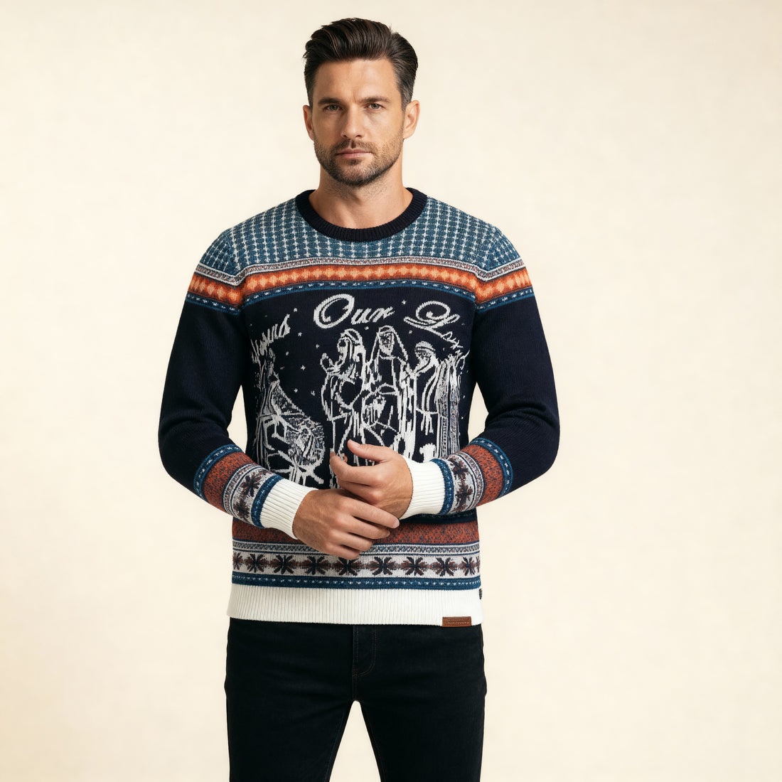 Ignite a passion for learning about Jesus Christ's birth in your children by sharing and teaching them about the nativity story on this meticulously crafted sweatshirt.