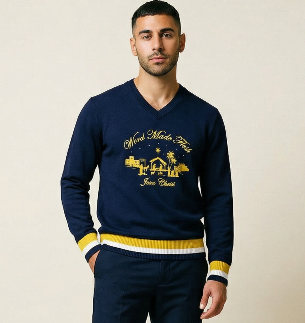 'WORD MADE FLESH' Knitted Navy V-Neck Jumper