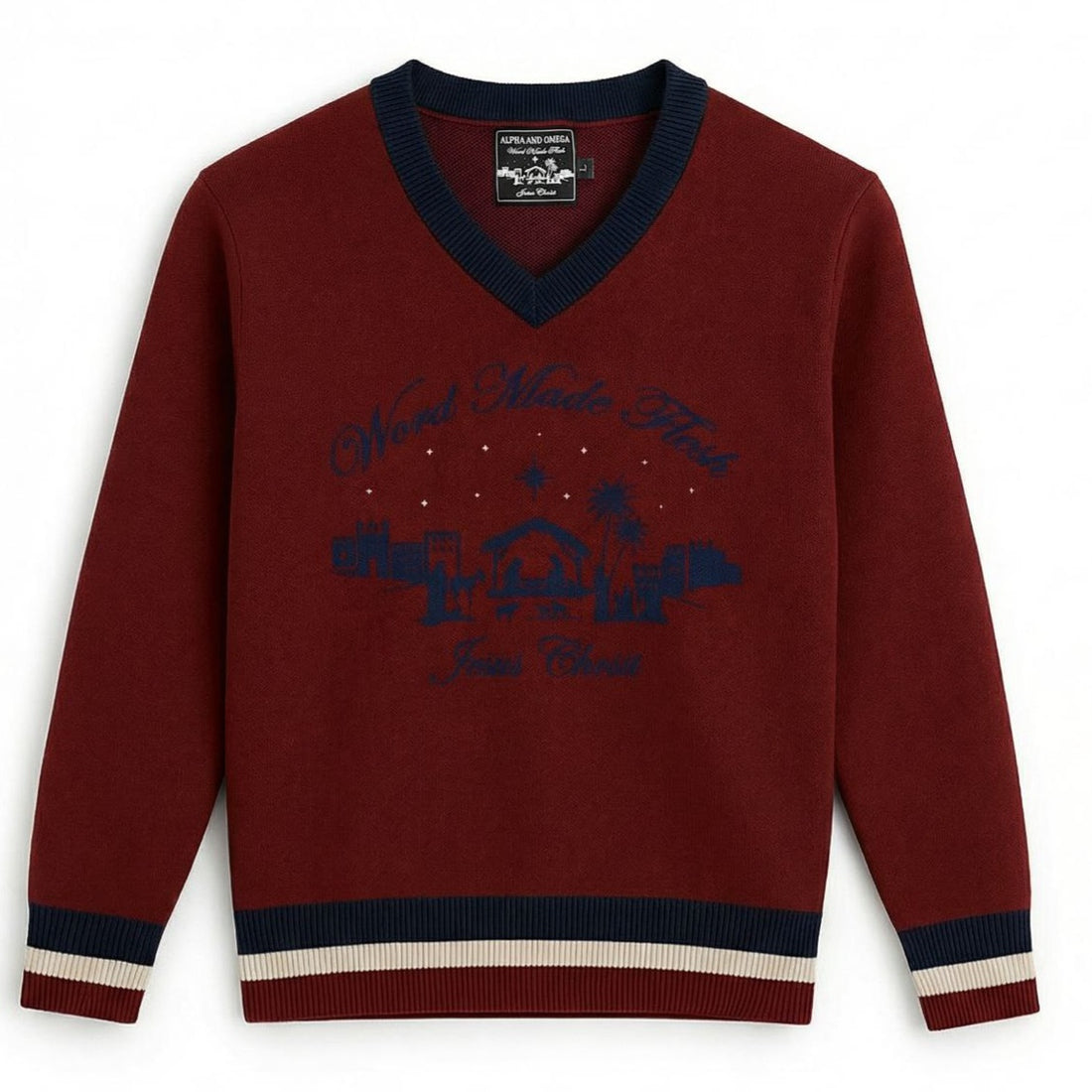 'WORD MADE FLESH' Knitted Burgundy V-Neck Jumper
